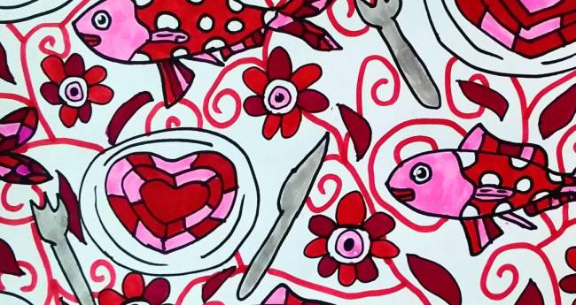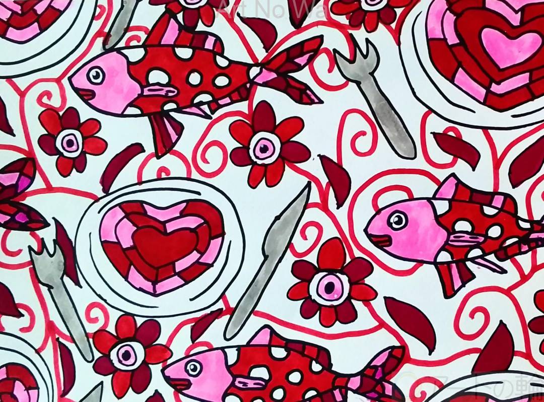 お皿の上に乗っているハートを心に表現し、喰らいつくしてしまいそうな感じに描いてみました。赤やピンク系の色でカラフルなキンメダイを描いてみました。背景も色に合わせて模様を描いてみました。目玉の花など少々不気味なところも可愛くポップに描いてみました。