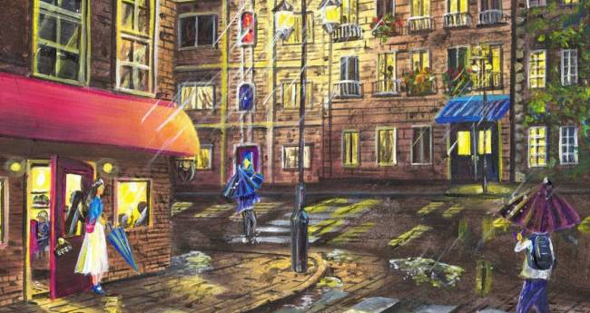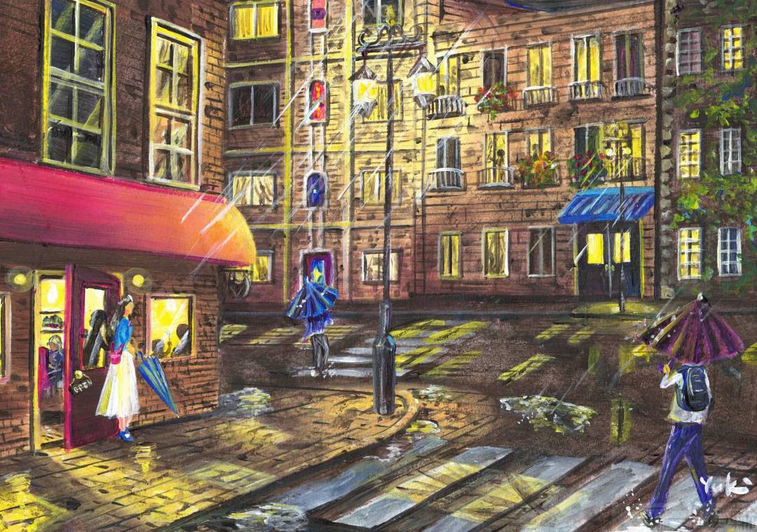 外食後に店外に出たら、雨が降ってきたイメージです。店内の賑わい。外の通行人がいるけれど、雨の降ってきた、静かでかすかな音の違いや、暗い中の照明の光などで、対比をしています。この雨の中を一人家に帰る。そんな物寂しさも、少し感じて頂ければ、と思います。