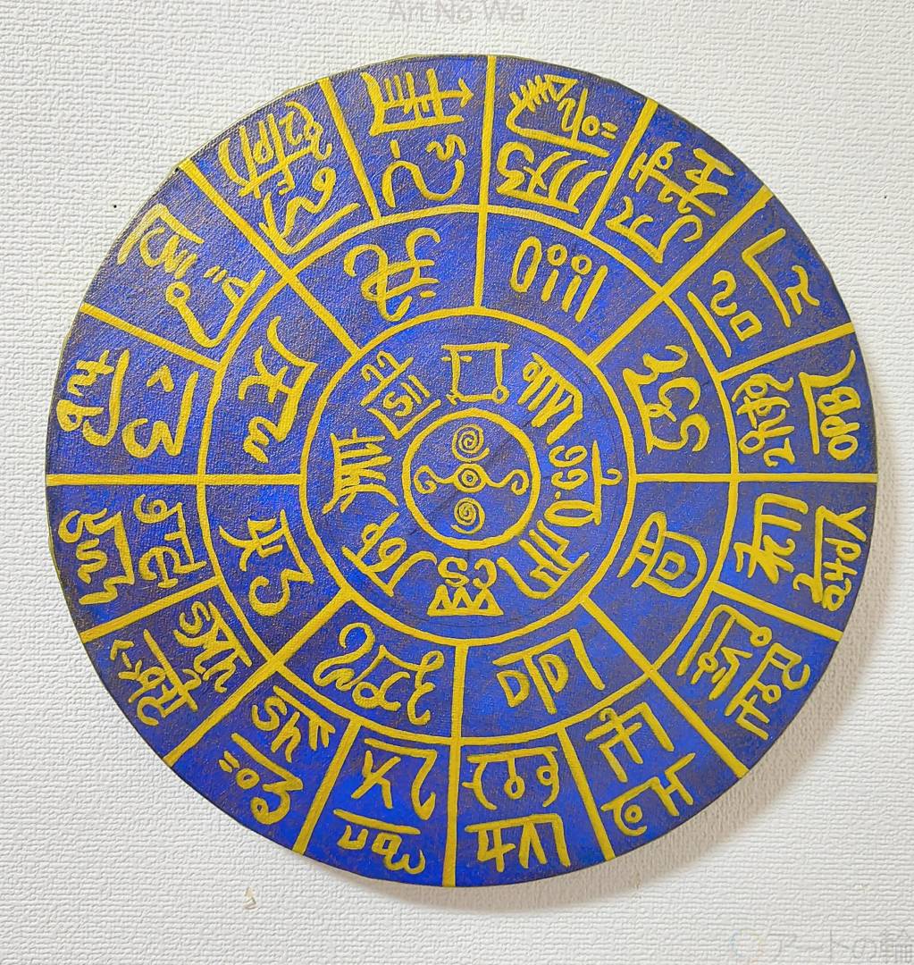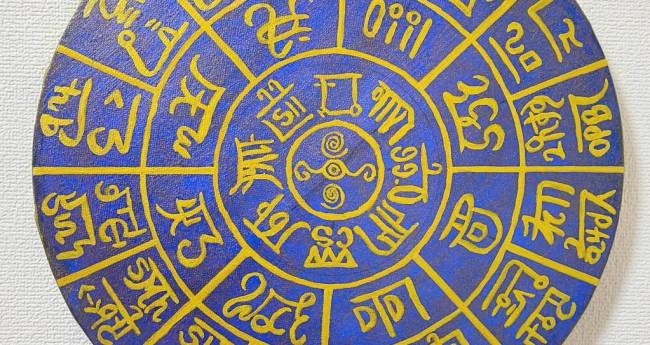 瑠璃の由来である「ラピスラズリ」の石盤に描かれた龍体フトマニ図をイメージしました。