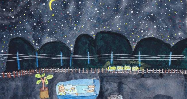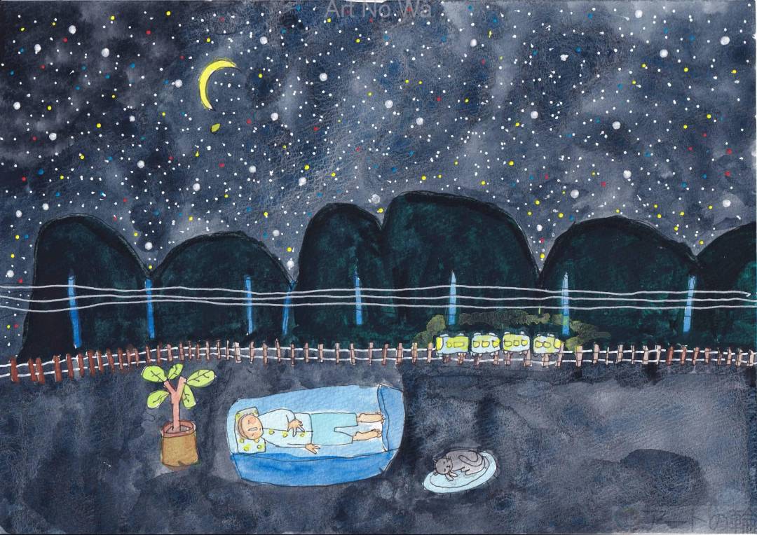 250926 toki 『眠大空に瞬く星に守られている。長閑に線路を走る電車の心地よい音に守られている。傍で眠る猫に守られている。いろんなものに守られて心地よく眠ることができるひとを描きました。