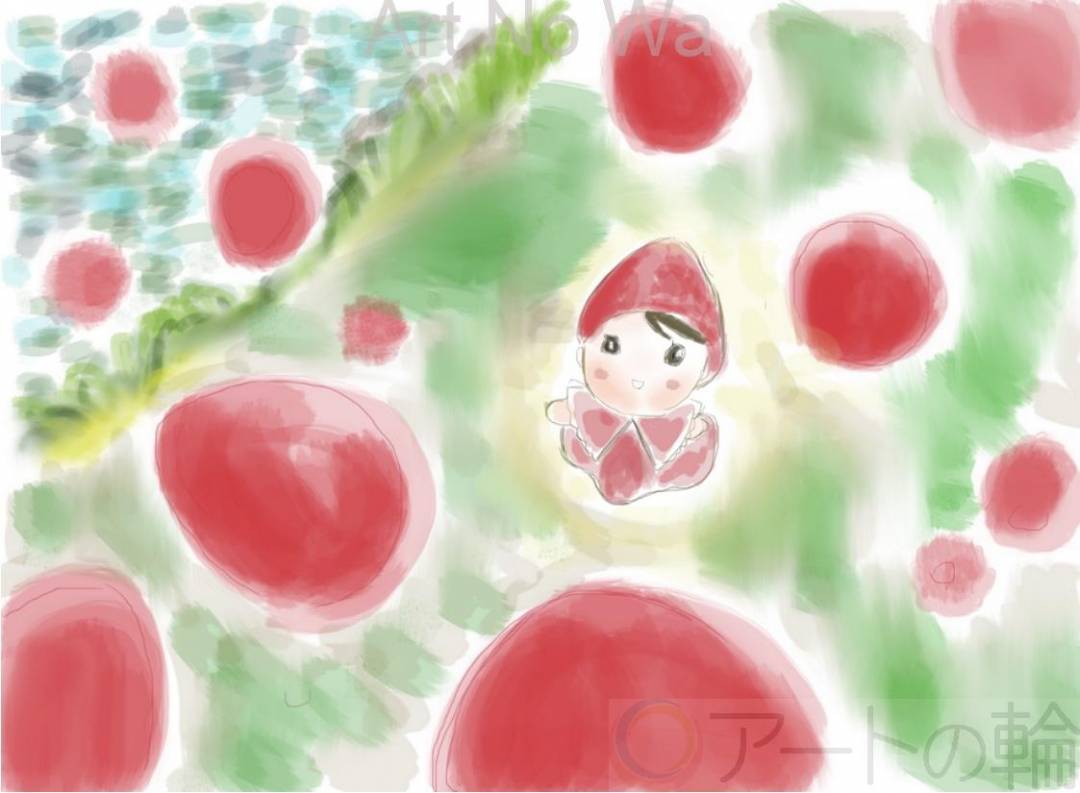非現実,屋外,自然,湖,春,赤,緑,人物,植物,想像上の生き物,風景,女性,子供,明るい,たのしい,かわいい,わくわく,どきどき,びっくり,2D