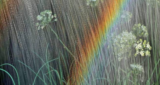 早朝、自宅庭の花に水を挙げている時に、背後からの太陽光によりきれいな虹が発生したので、それを撮り作品に仕上げました。