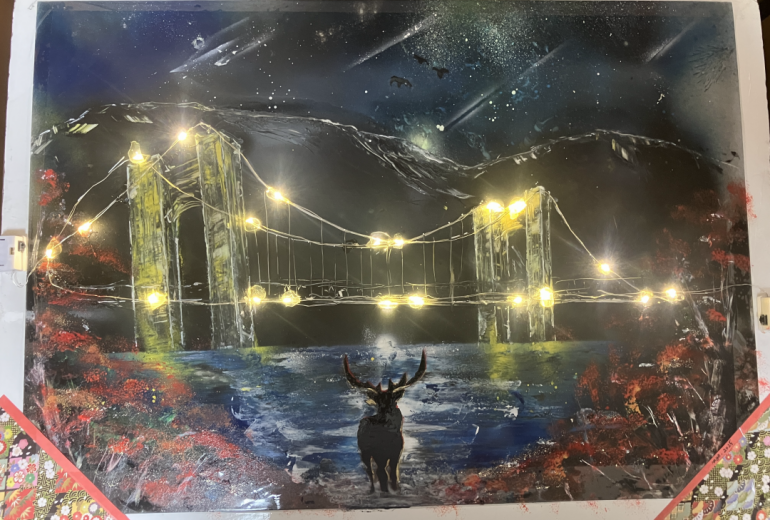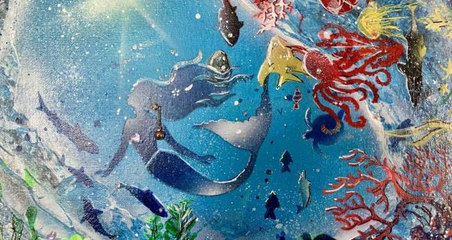 ともいき(海ver)」は、人魚や魚、クラゲ、サンゴを光と色彩で描き、海に生きる命の調和を表現した作品です。発光塗料により、深海の神秘と命の輝きを幻想的に浮かび上がらせました