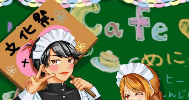 文化祭のメイドカフェの楽しげな一コマを描きました。