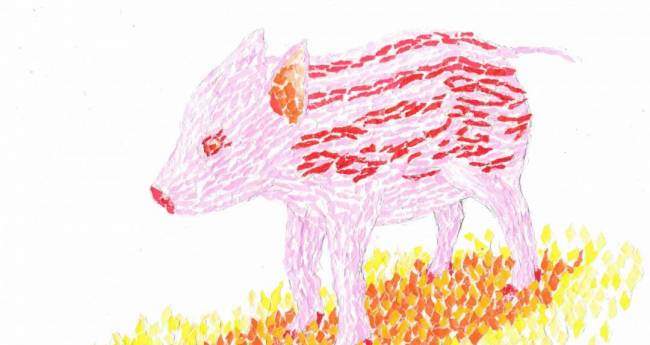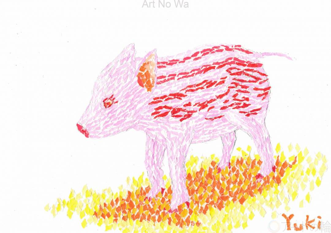 草の上をのんびりと歩く子猪です。とにかく可愛く、ふかふかの草を歩いている様に見える雰囲気を出せる様にちぎり絵にしました。