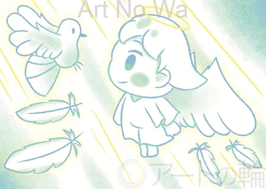 眩しい光の中で、偶然天使の子と白い鳩が出会った様子です。