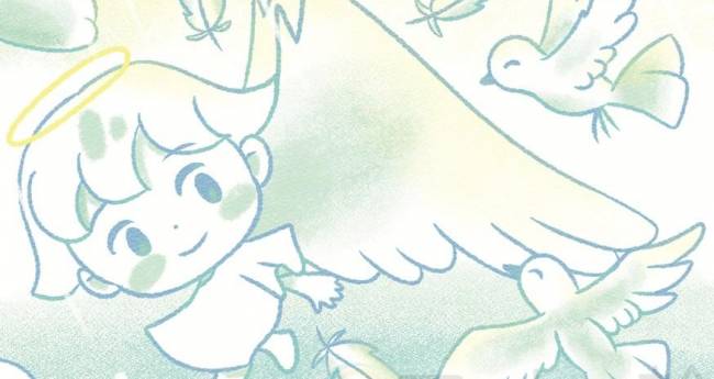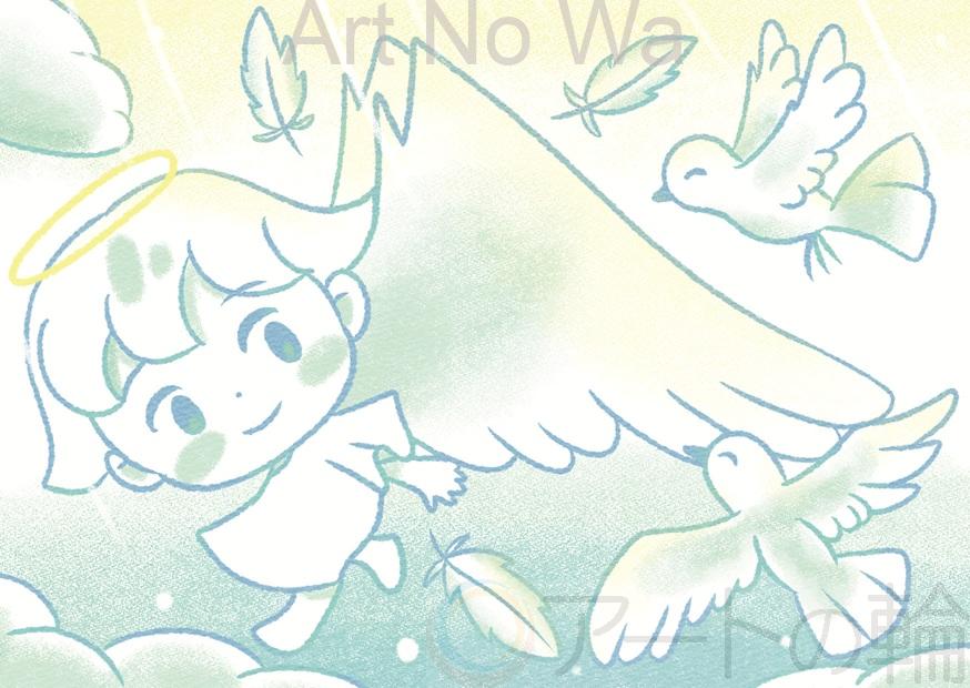 天使の子が飛ぼうとすると、後ろに白い鳩たちが追いかけてくる微笑ましい様子です。