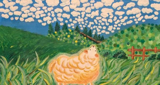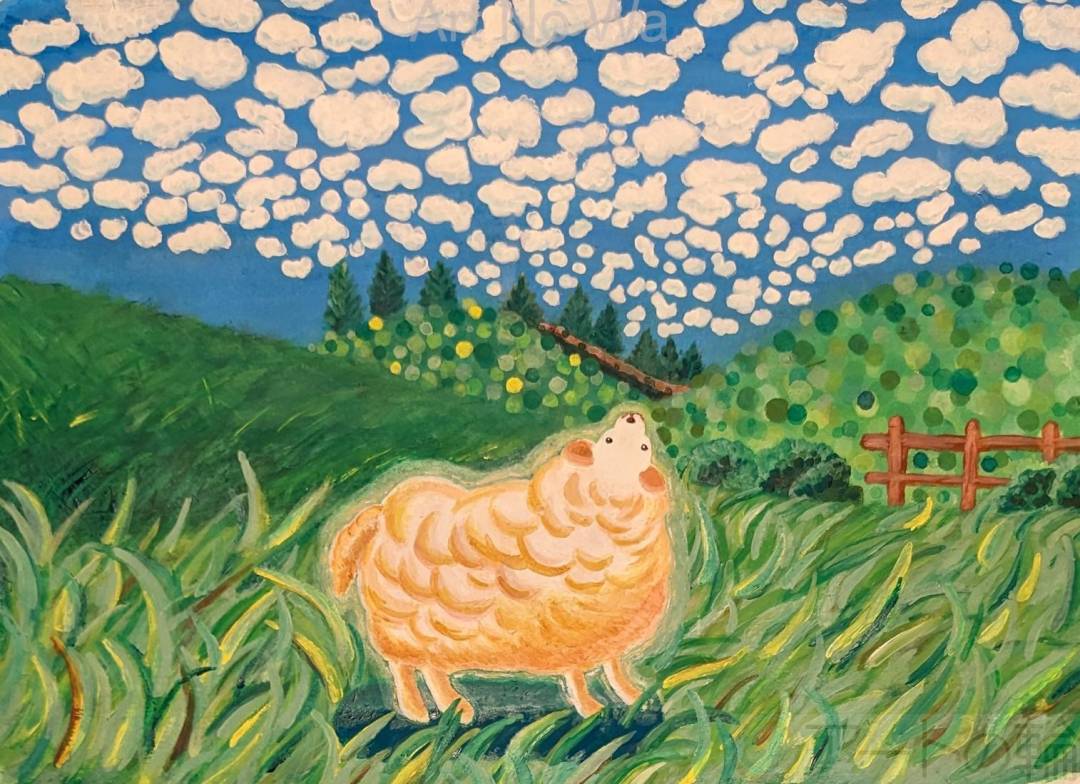 ひつじも、羊雲のようになりたかった。高みをふわふわ、自由に飛べて__。はみごにならずに、仲良く群れて__。形は似てるけど、ボクにはできないことばかり。憧れると、手が届かない自分に苦しくなった。がんばっても、(羊雲のようには)がんばれない自分が嫌になった。…「役回りは、同じじゃない。」「似てるけど、違うんだ。」って教えてもらってからは、空の青の広さが見えて__。羊雲の柔らかさも、自分の足もとの緑の優しさも、空までは届かない地についた足跡も。守ってくれている柵も、そこにいるボクの身体も、どちらもが、なぜか愛おしく見えた…。