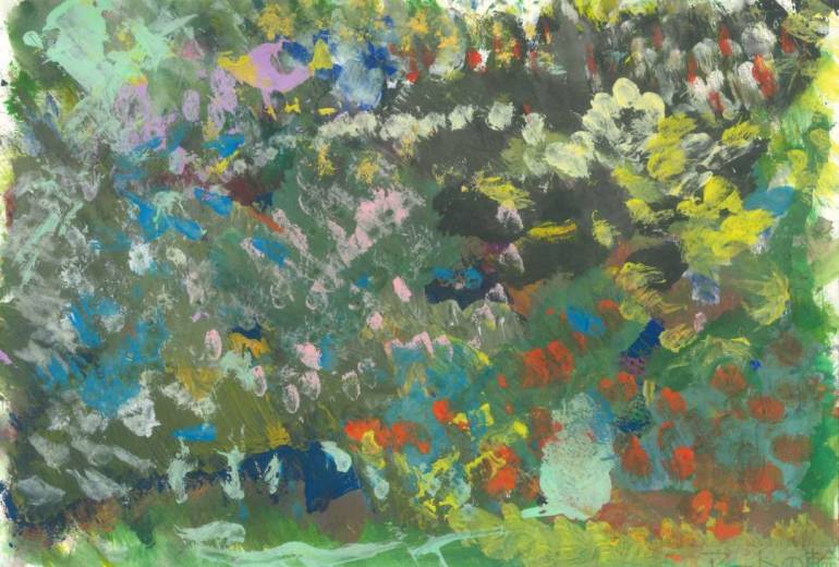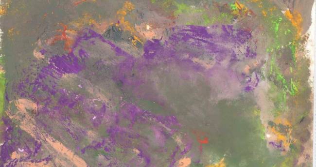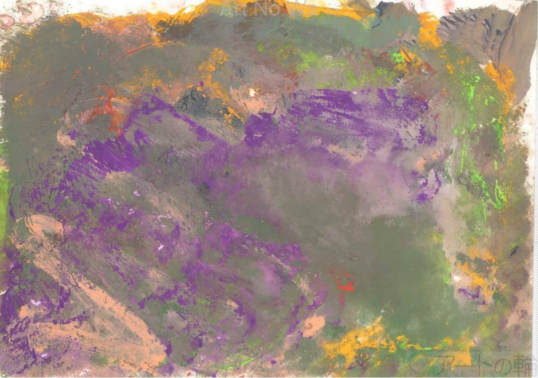 紫と灰緑の色がやわらかく溶け合い、静かなうねりを感じさせてくれます。まるで大地の奥深くに眠っていた記憶が、陽の光に導かれてゆっくりと目を覚ますようです。ところどころに現れる橙や緑の色が生命の息づかいのように輝き、作品全体にあたたかなリズムを与えています。抽象的でありながらも、自然の移ろいや時間の流れを感じ取ることができ、見る人の心に静かな余韻を残してくれます。