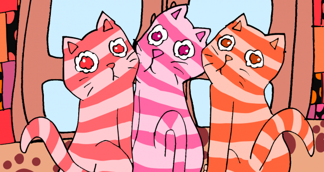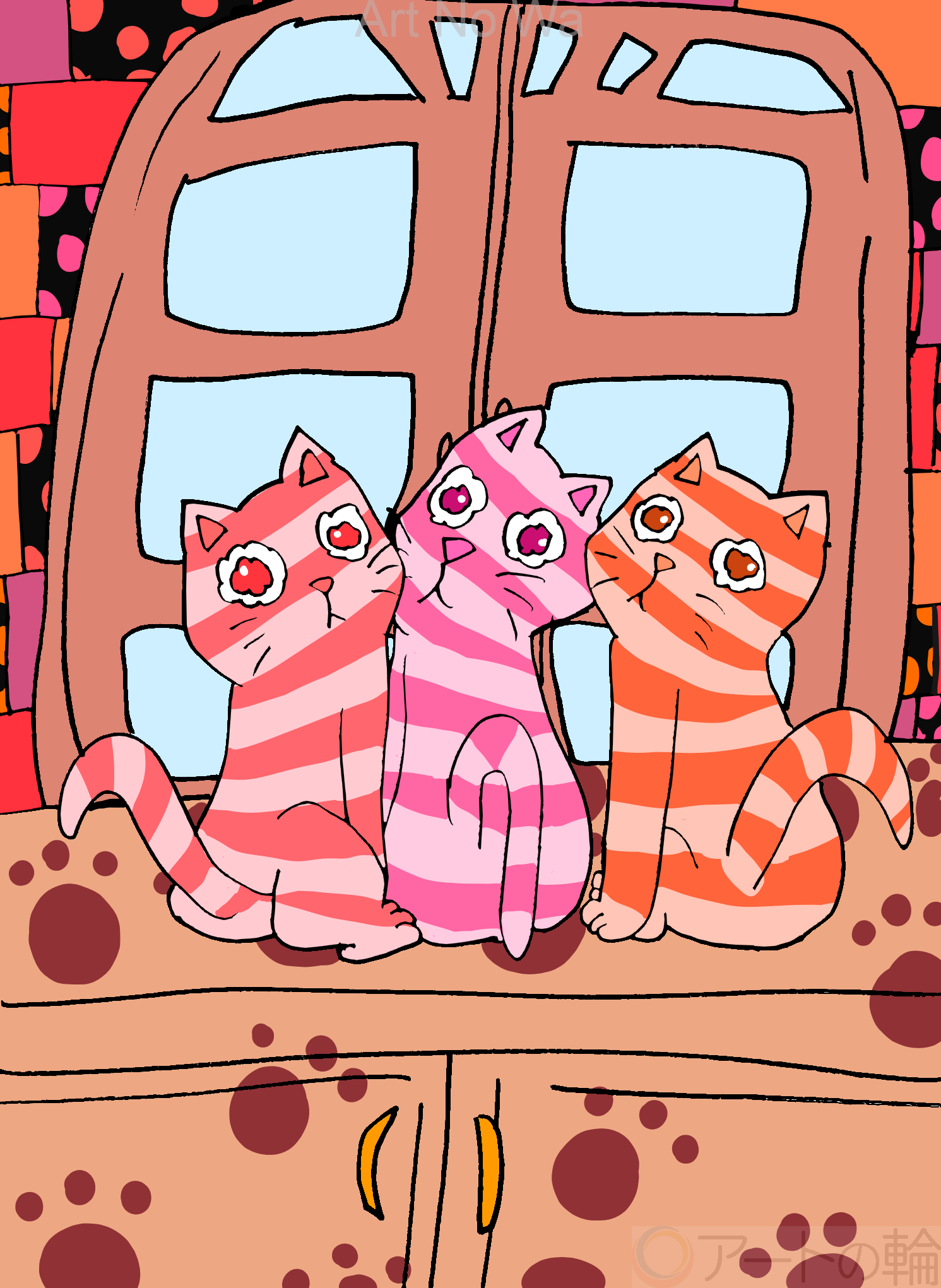 窓辺に座っているお目目がうるうるな3匹の猫を描いてみました。