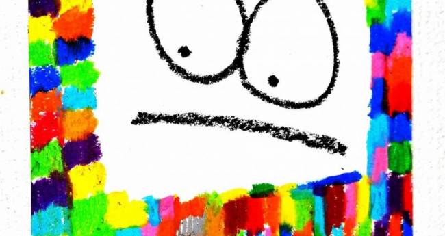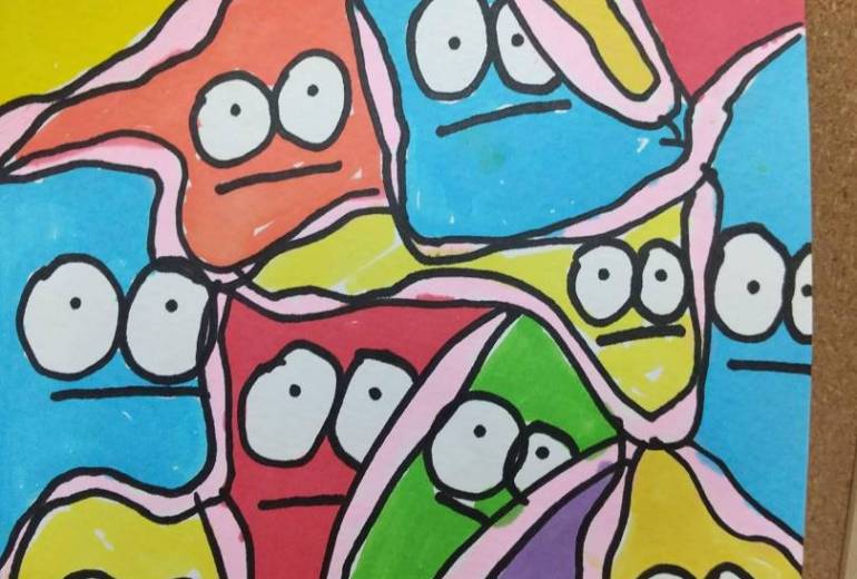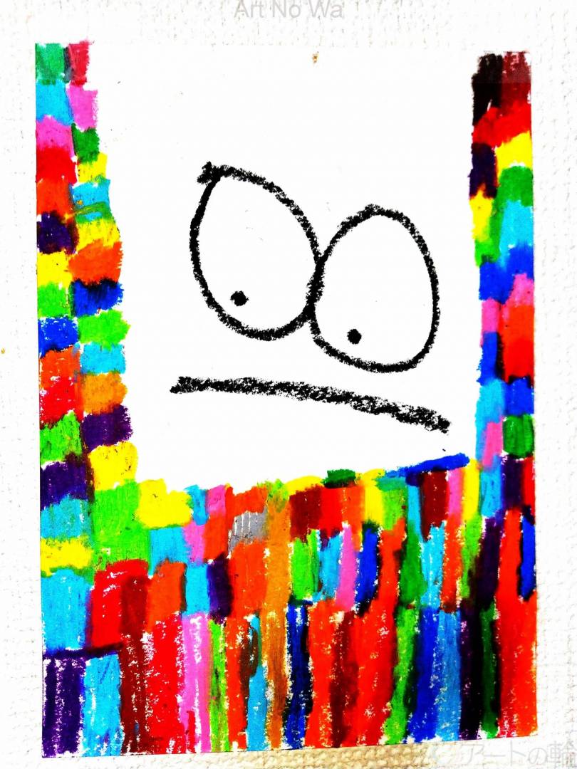 色々な色を使ってカラフルに楽しげに書きました。上の大きな目はデカ目ちゃんというオリジナルキャラクターです。