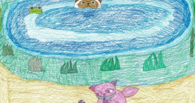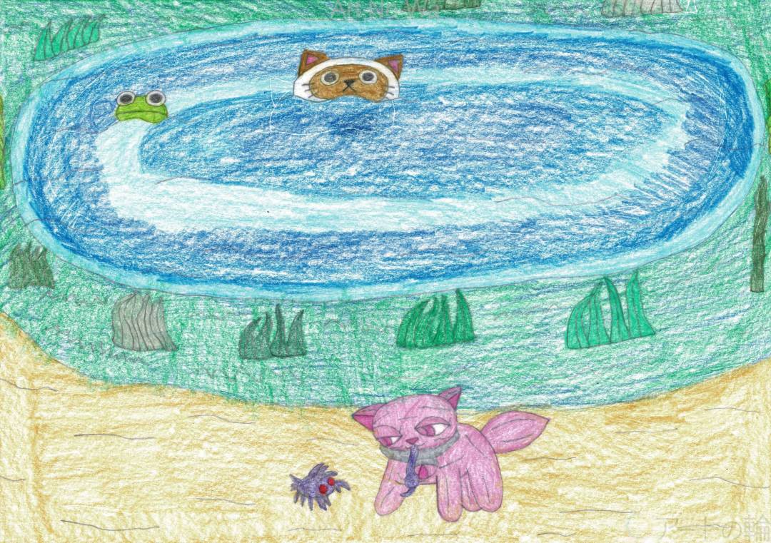 校長とげこすけは、湖の中でくつろいでいます。キャサリンは、サソリの尻尾を嚙みちぎっています。