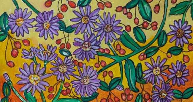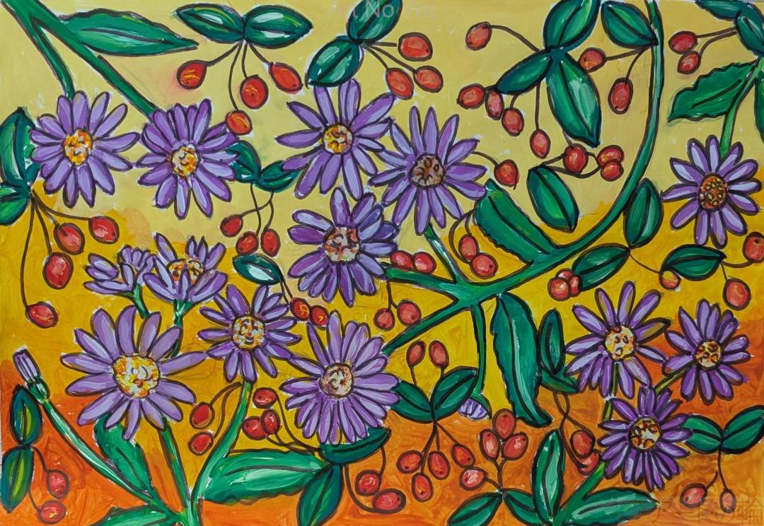 秋らしい花。紫や赤い実を描いてみた。
