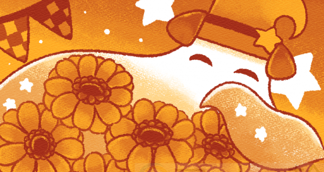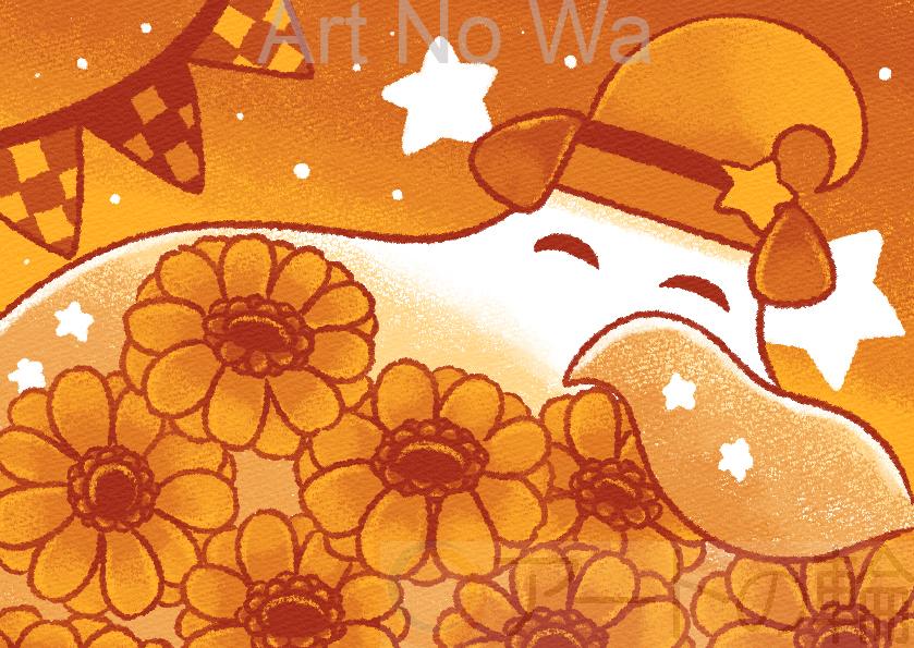 大切な橙のガーベラを微笑みながら支えるオバケさんです。