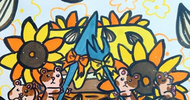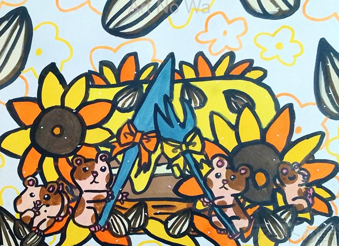 ひまわりと種がいっぱいなパンケーキを描いてみました。ハムスター達も喜んでいます。