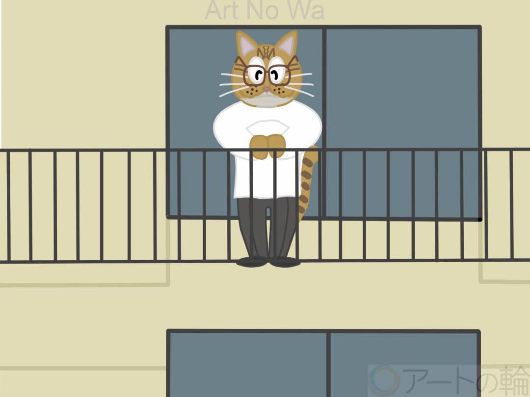 猫が家の外をベランダから、眺めている所を描いてみました。力作です。