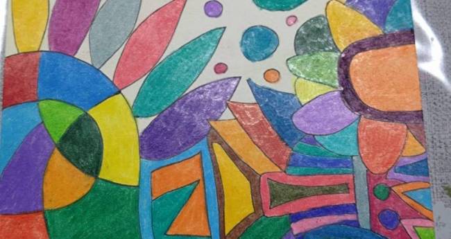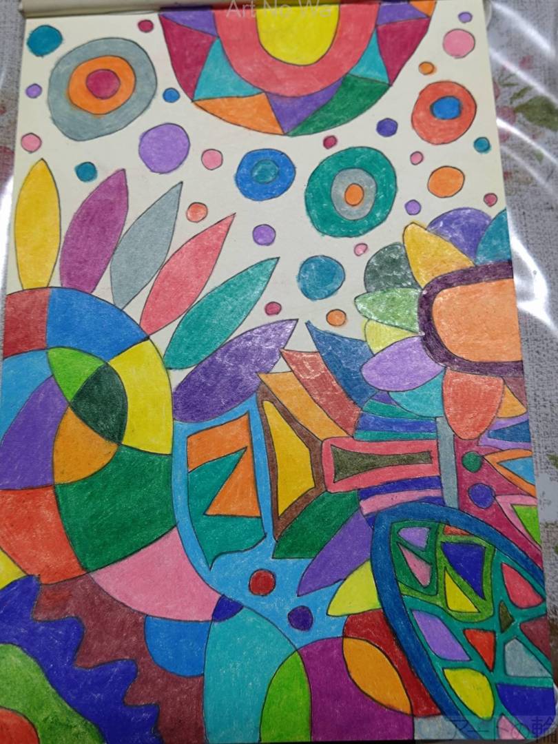 上にある半月の模様は、パワーを表しており、人からの嬉しい言葉を含んでいる。それが自分には大事な絵の活力でありエネルギーで、柔らかな丸になり、植物や人の住む街へと浸透していく。その力はプラスエネルギーや温かい光(心)を表現していて自分の心に寄り添い力をくれる。