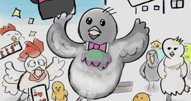ハトのマジシャンが帽子のマジックを披露しています。これにはニワトリもびっくり。