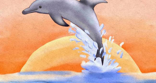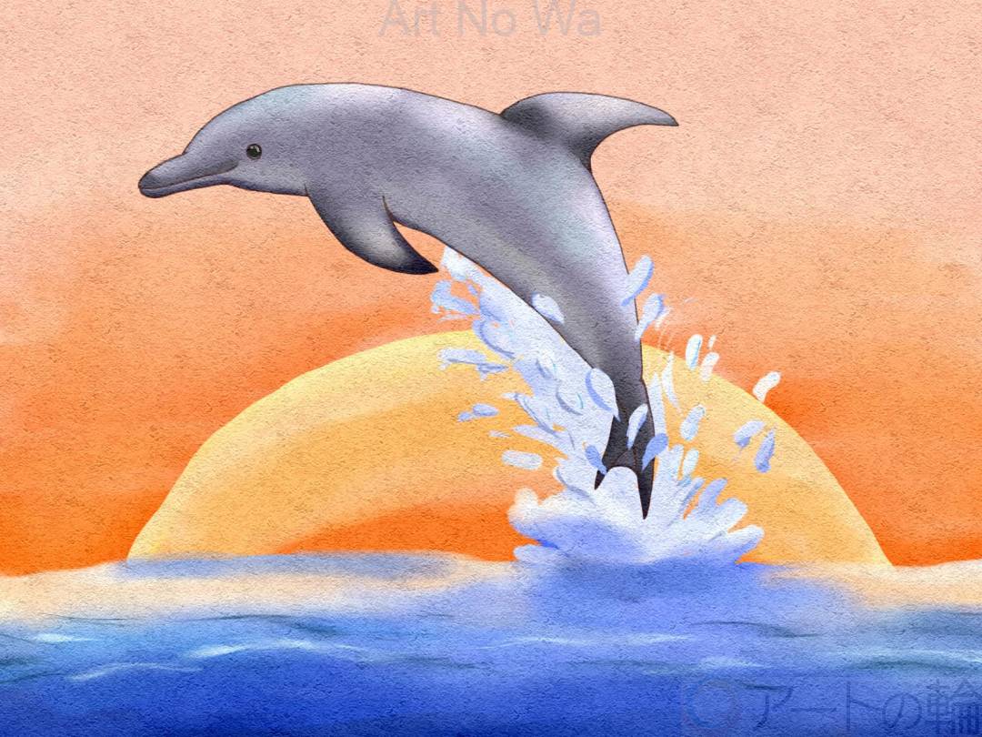 夕日が沈んでいくなかジャンプするイルカのイラストです。