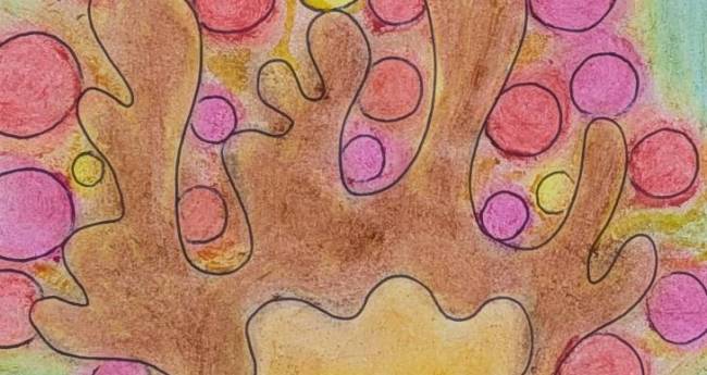 大樹とそれに実る樹の実で、命と心をイメージして描きました。オイルパステルで描くことで、命の力強さと心の温かさや儚さを表現しました。