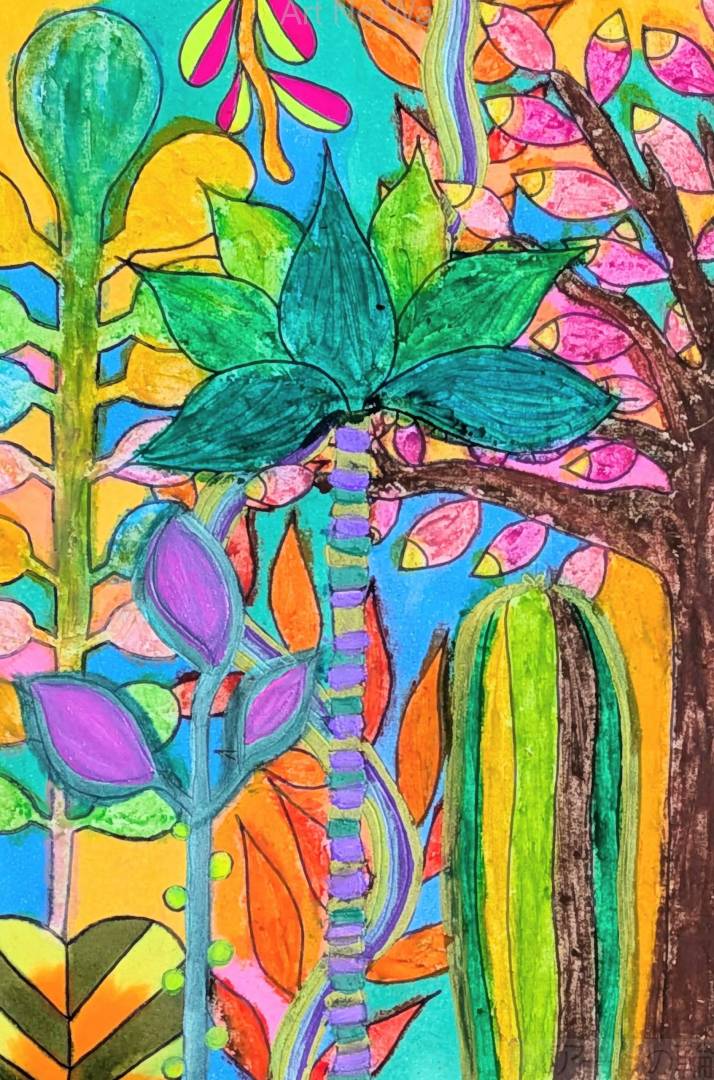 ジャングルに生える植物たちや、天気がコロコロ変わる様子をたくさんの色で表現し、力を込めて色を塗ることで、自然の力強さを表現しました。