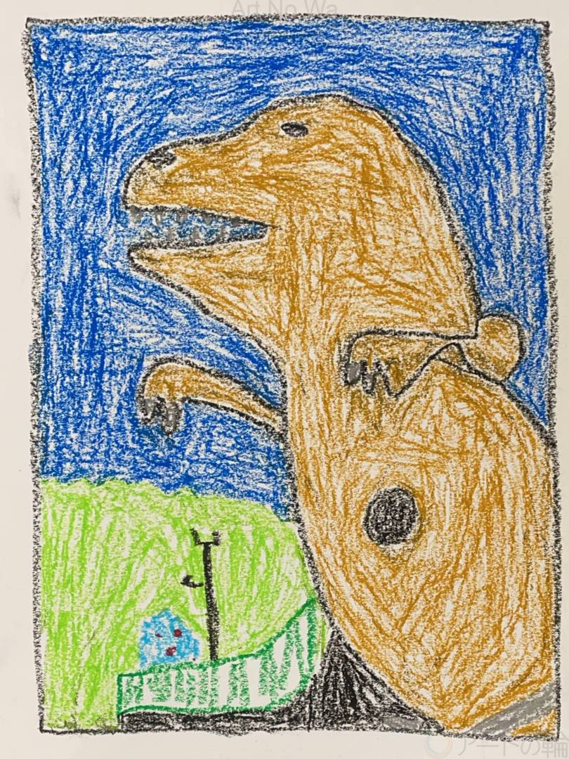 山口県の笠戸島にいるティラノサウルスをクレヨンで描きました。
