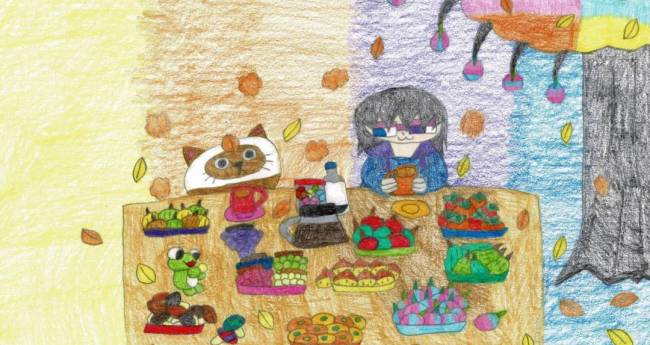 にぼしと校長が外でお茶会をしています。にぼしは、カフェオレを飲んでいます。校長は、頭の上に葉っぱを乗せています。机の上には、梨、ぶどう、きのこ、りんご、栗、みかん、柿、ラフランス、木の実があります。カエルの「げこすけ」は、ぶどうをつまみ食いしています。木の葉の色も、冷たい色に変わっています。