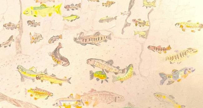 アユ、ヤマメ、ヤマトイワナ、オイカワ、ニジマスの色違いや模様にこだわりました。繁殖期のヤマトイワナのオスが緑っぽくなるみたいです。