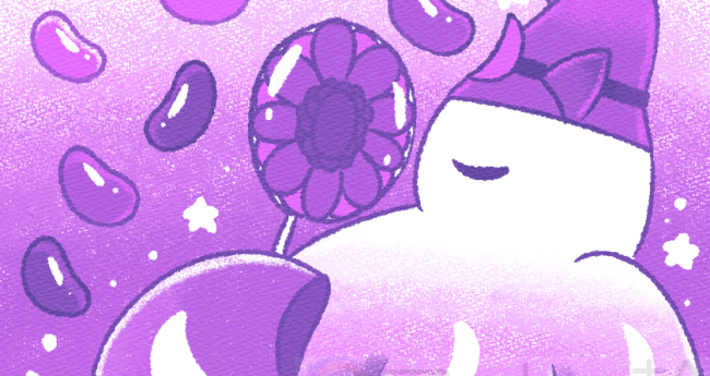ぶどうの香りがしそうなガーベラの紫色のキャンディーを食べようとする、紫オバケさんです。