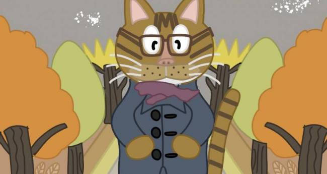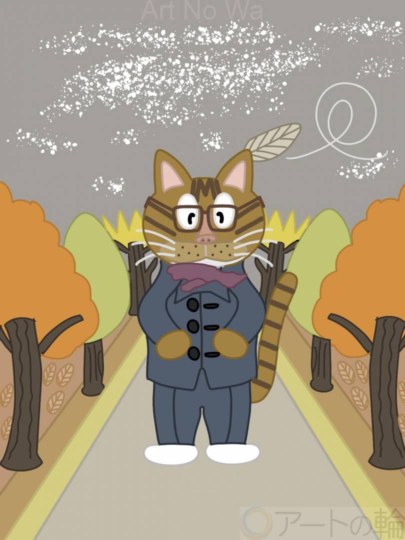 猫が秋の並木道を歩いている所を描きました。オリジナル作品です。
