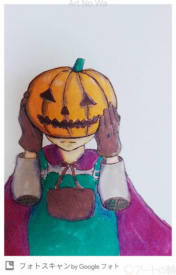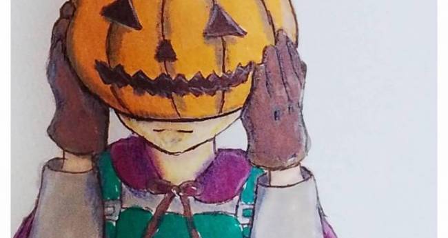 ハロウィンの日、ボクはカボチャのヒーローになる! 内気な少年がハロウィンの日にヒーローになる物語を想像して描きました。原画はハガキサイズです。