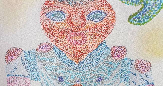 勾玉を通して祈りを捧げる合掌土偶さんを、点描+なイメージイラストで描いて見ました。