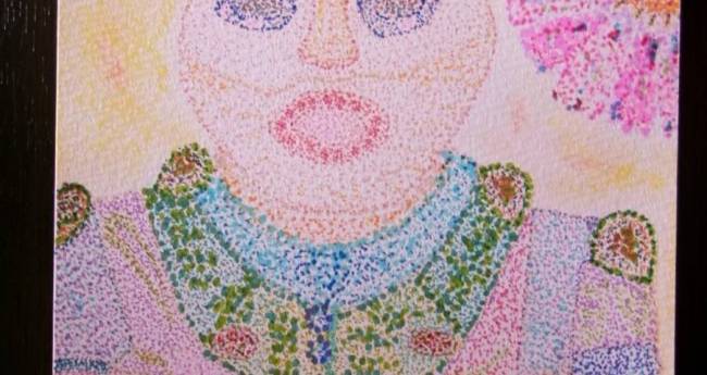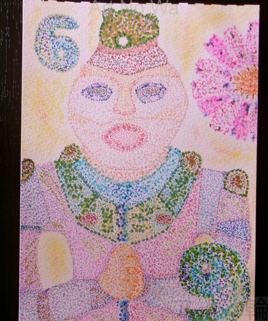 勾玉を通して、悠久の秋(とき)を秋桜(コスモス)と共に、祈り続けて入る合掌土偶さんを、点描+なイメージイラストで描いて見ました。