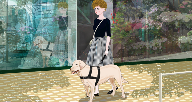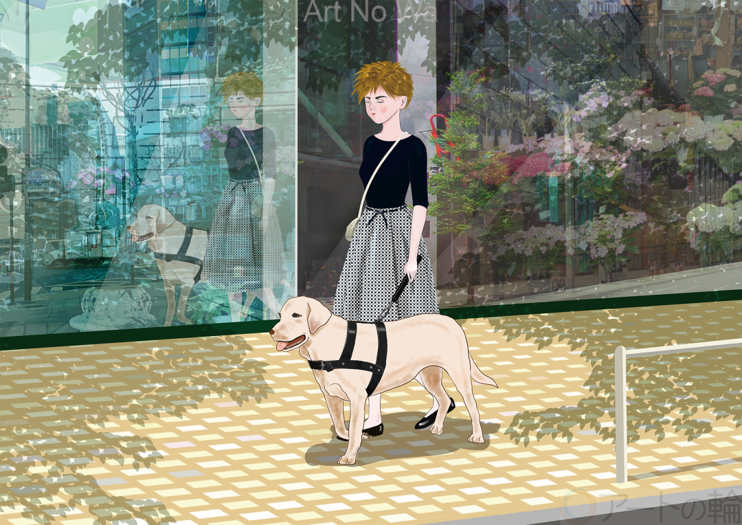 障害があっても盲導犬の助けで楽しくお出かけができると言う事を絵にしました。印刷用データもあります。