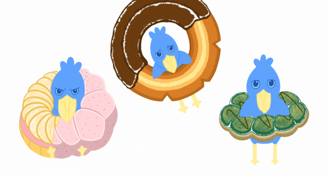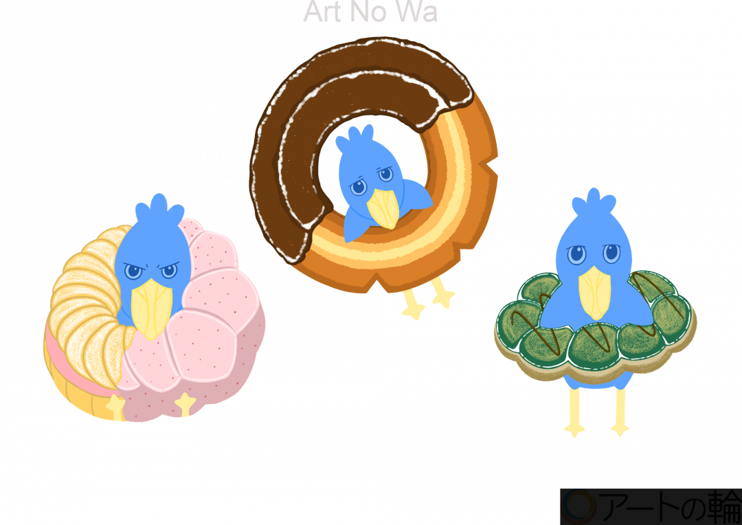 ドーナツから顔を覗かせている可愛いハシビロコウたちを描きました。
