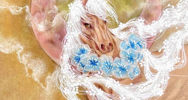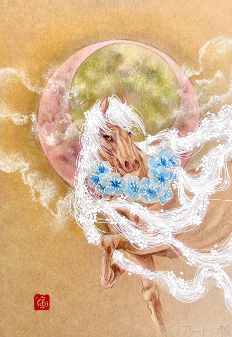花を貴ぶ馬の深い愛情を表現しました。 画材:ミューズ クラフト紙、レンブラントソフトパステル、プリズマカラー色鉛筆、胡粉、パール顔料。