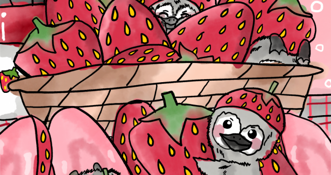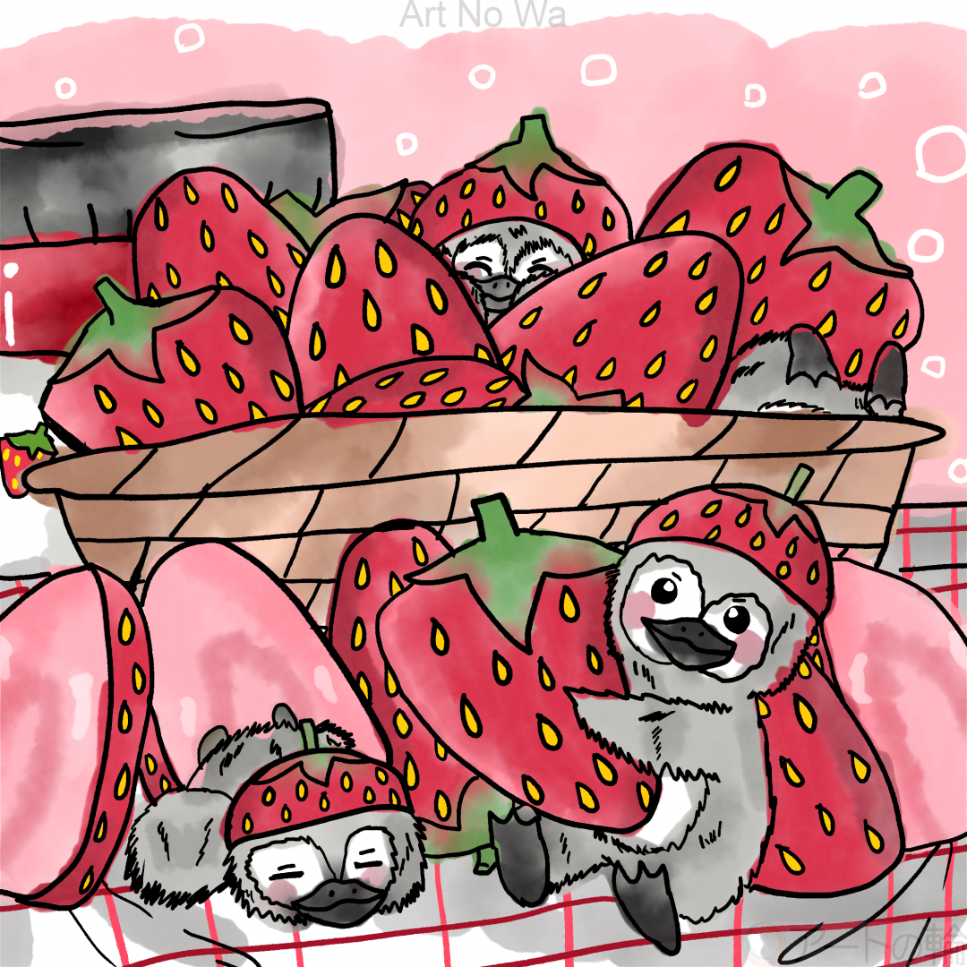 苺に囲まれて幸せそうな子供のペンギン達を描いてみました。