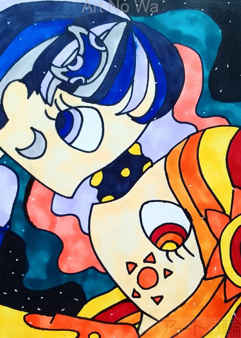 お互いに見つめ合っている太陽と月の女性を描きました。
