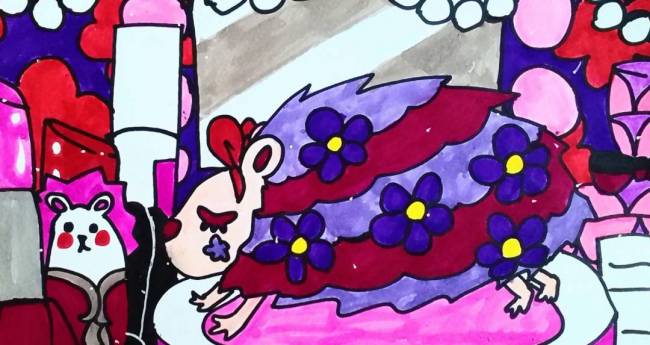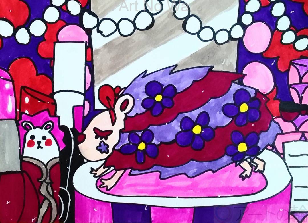 鏡の前でおしゃれをしているハリネズミを描きました。