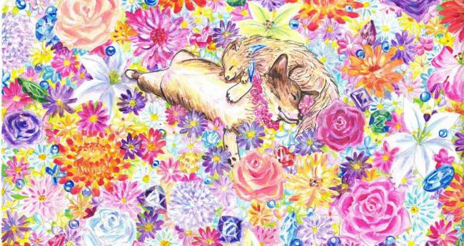 今は亡き先住犬と今飼っている犬、この2匹が熟睡している所を見ると、苦しくて辛い時も、私に癒しをくれます。「愛」の花言葉を持つバラやヘリクリサム等が2匹を囲み、そこに美しい輝きを放つ宝石のルースがある事で、また違った愛しきものとなる。そしてアスターの「私の愛はあなたの愛より深い」の花言葉が、愛犬2匹への想いをより深くしてくれるイメージです。