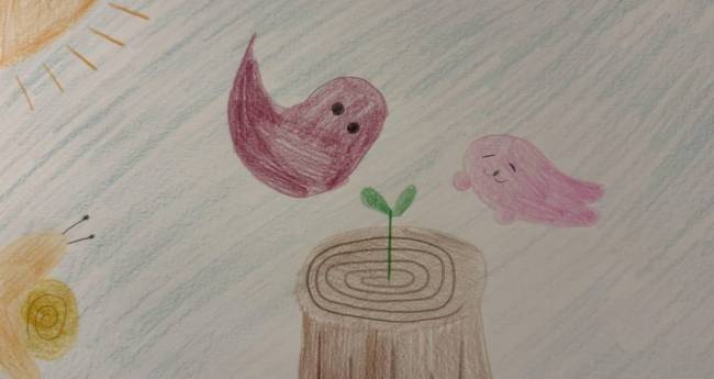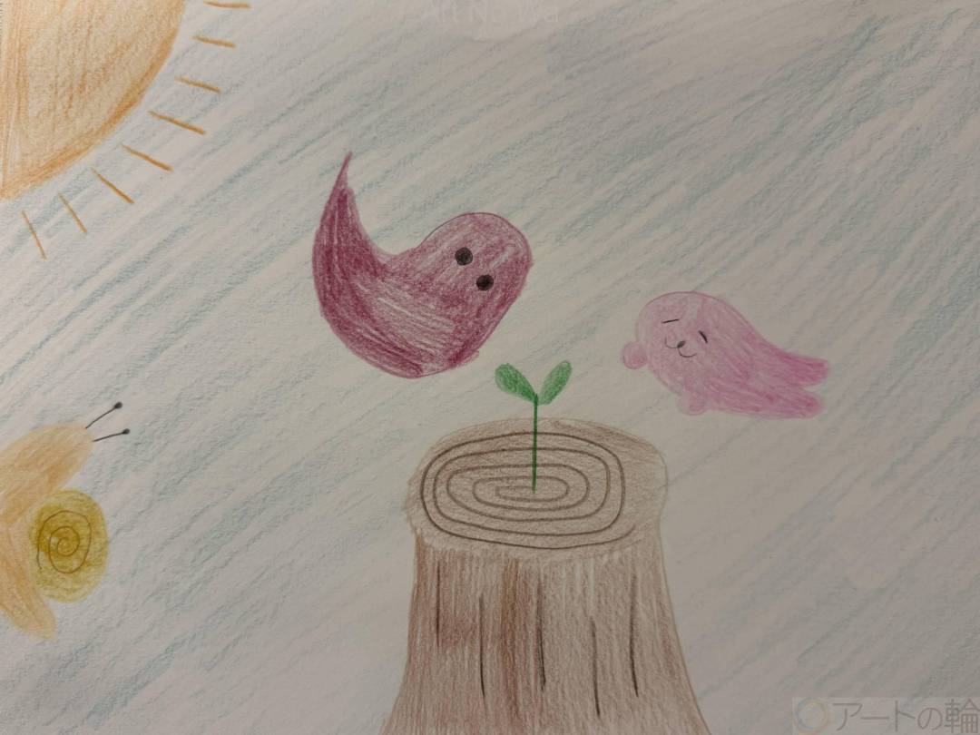 切り株から芽がでたのを見守っているおばけとアザラシ