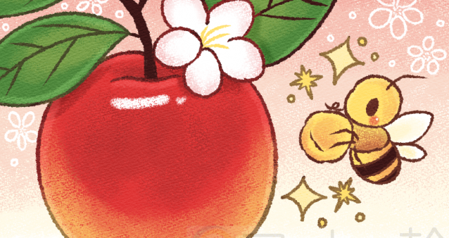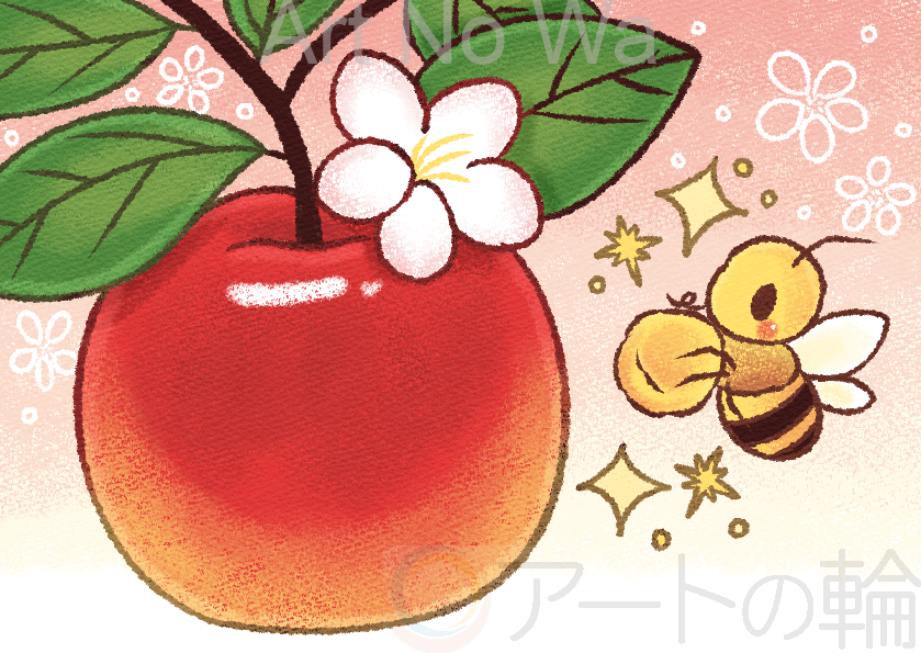 これから赤いりんごになるであろう花に、蜜をプレゼントするミツバチさんです。