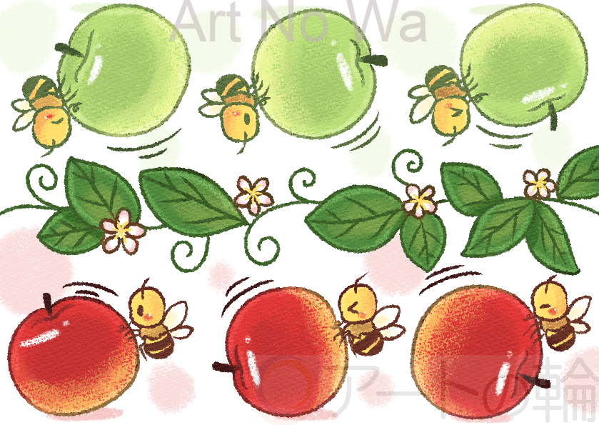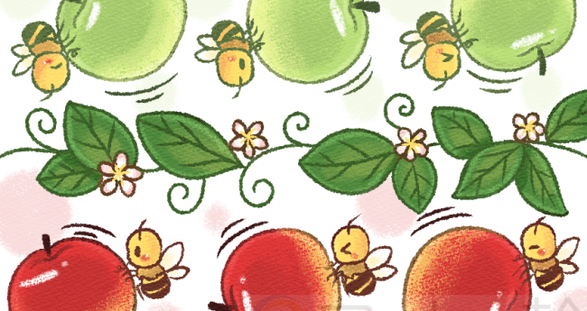 とある目的地まで、協力し合いながらりんごを運んでいくミツバチたちです。