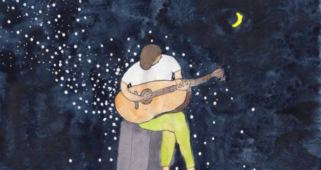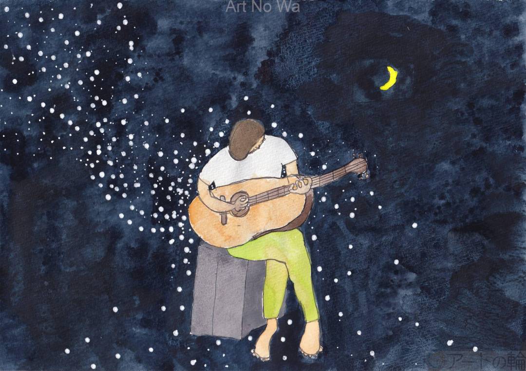 月灯りの下でギターを弾く人を描きました。自分の思いをギター弦に乗せてつま弾く様子です。音が暗やみの中にとけ込んでいくような空気感を表現しています。