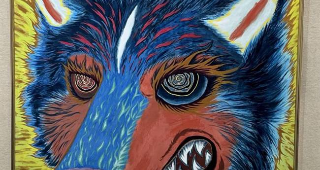 亡き愛犬ごまをモデルにしてコロナ禍の中、自分の怒りや憤りを表現しました。日本画。
