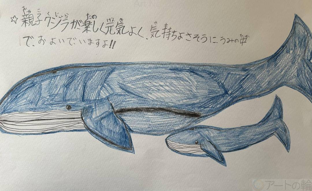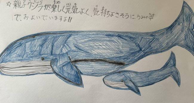 親子のクジラが楽しく元気よく、気持ちよさそうにうみの中で、およいでいますよ!!