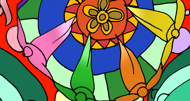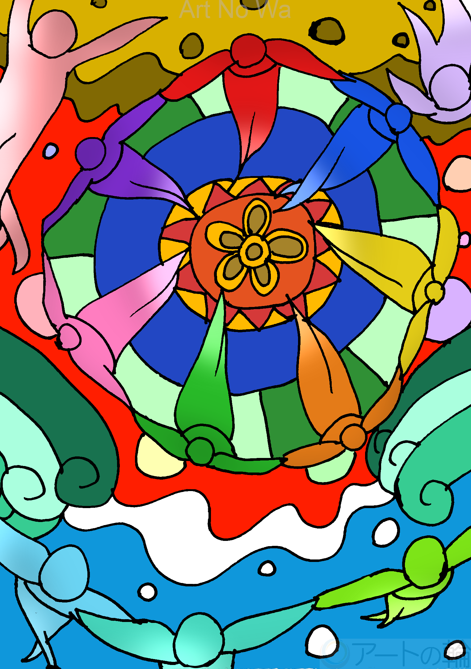 七色のように人が輪になって繋がっている様子を描いてみました。