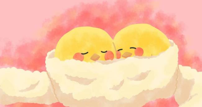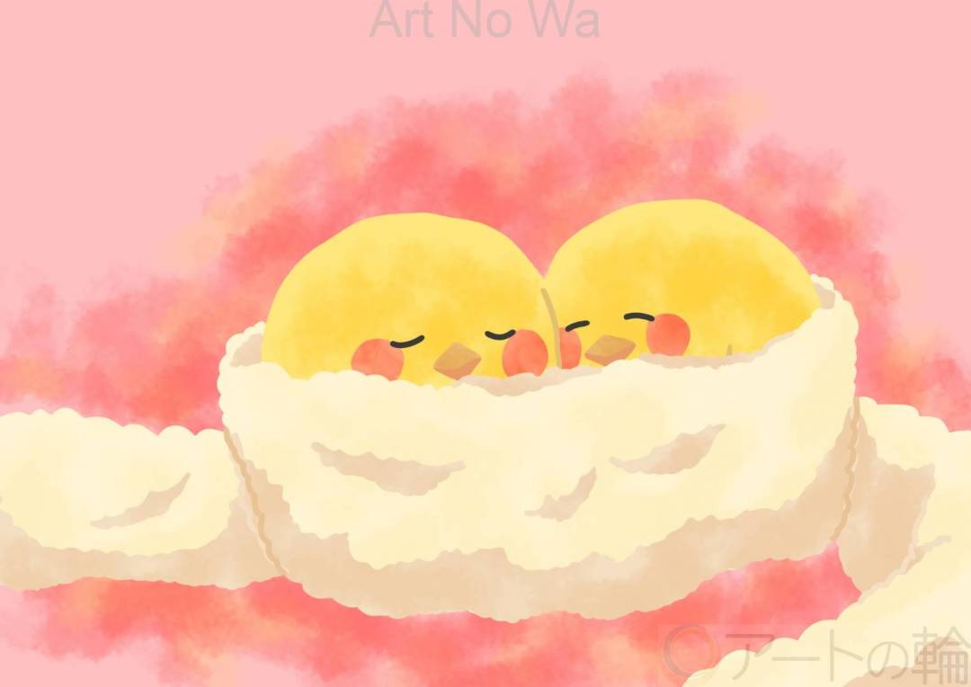2匹で身体を寄せ合い、マフラーにくるまりお互いを暖め合うひよこたちです。