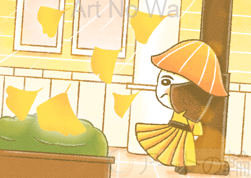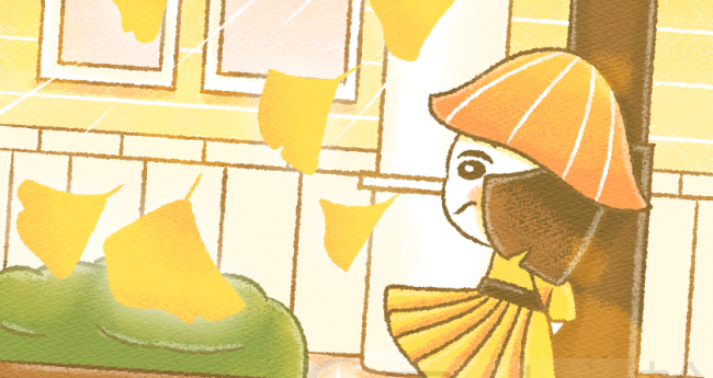 静かな街でふんわりと銀杏が飛んでいる様子を観察する少女です。