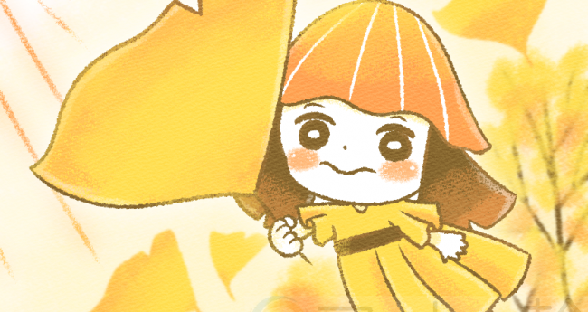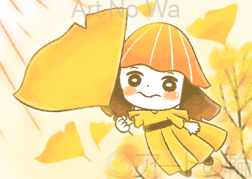 風の方向に向かって、大きな銀杏の葉を握りながら旅立つ少女です。